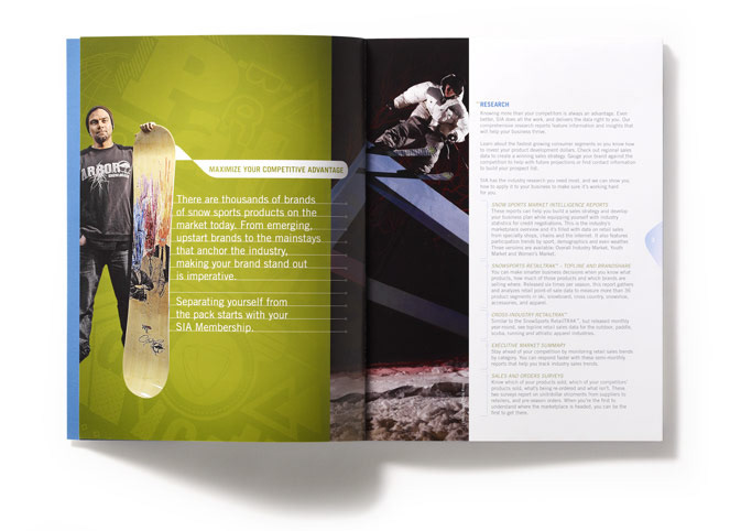 Corporate Brochure for SIA (Snowsports Industries America) to promote the associations benefits and offerings to the snow sports industry. Brochure features photography from brands such as Rossignol, Scarpa, and ROME.